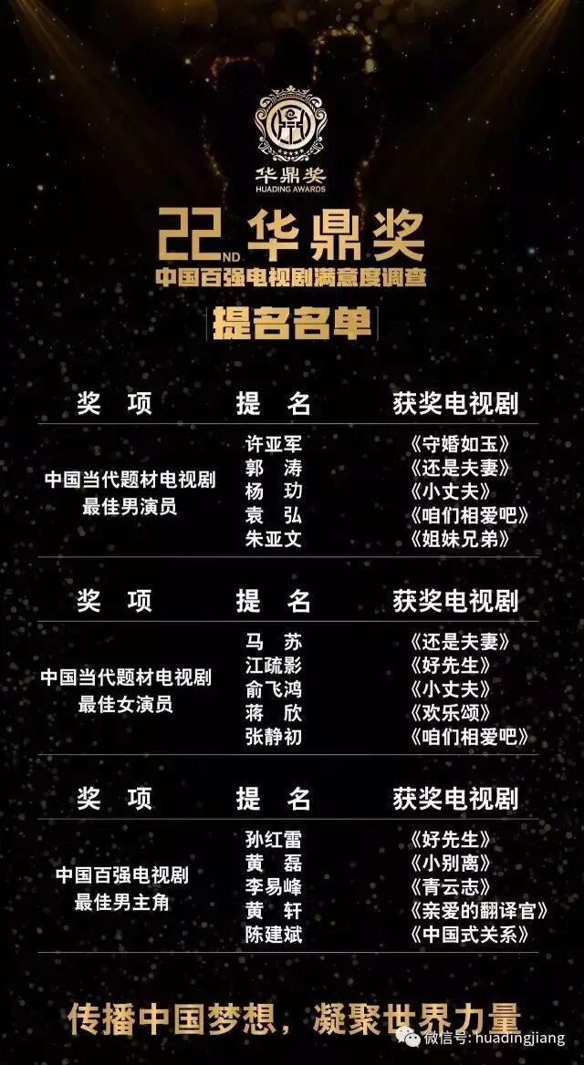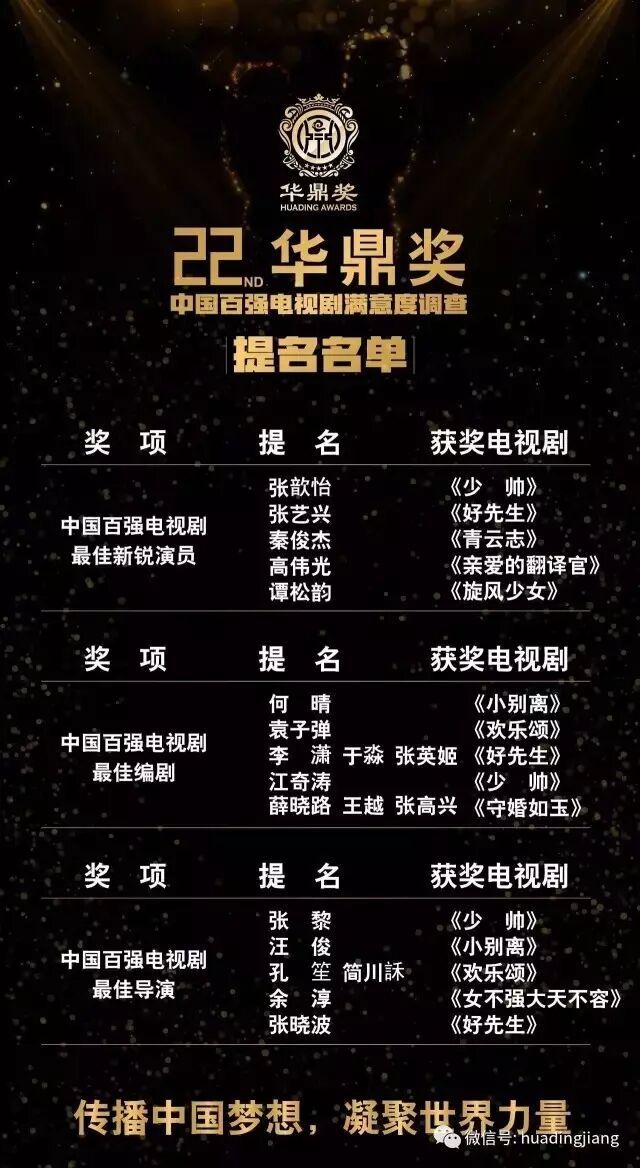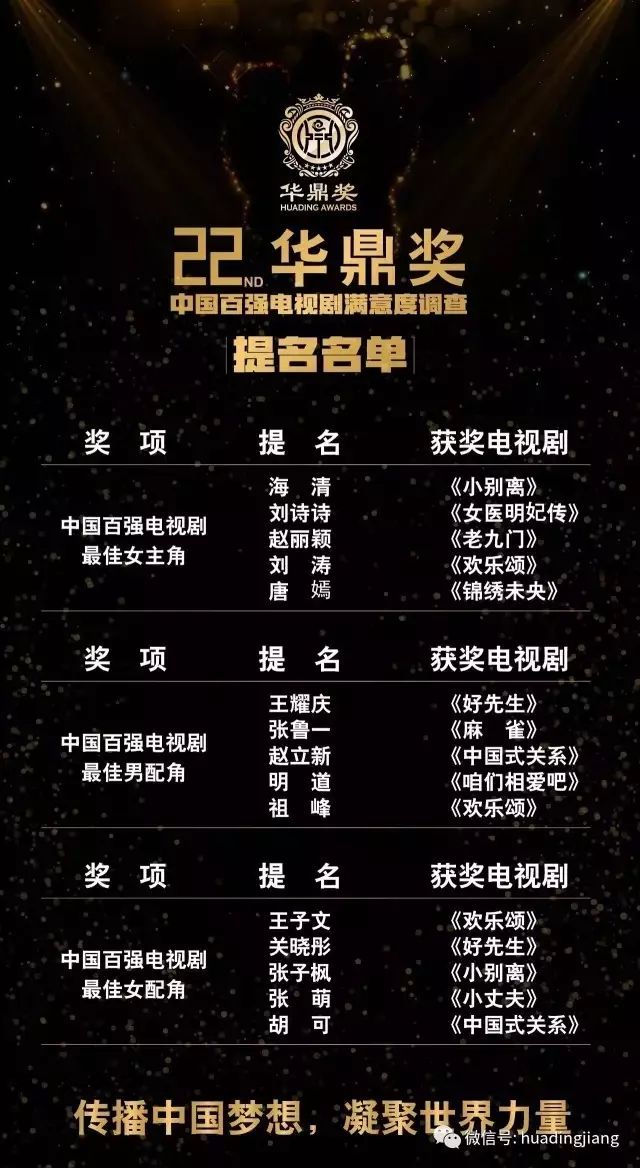 华鼎奖包含:“全球演艺名人公众形象满意度调查”、“中国/全球电影满意度调查”、“中国百强电视剧满意度调查”和“全球音乐满意度调查”等奖项。第22届华鼎奖也就是本届了,就是“中国百强电视剧满意度调查”。