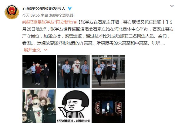 据 @石家庄公安网络发言人 发文,9月28日晚8点,张学友世界巡回演唱会石家庄站在河北奥体中心举办,石家庄警方加强安检,紧密巡逻,通过技术比对成功抓获三名网逃人员,包括涉嫌故意毁坏财物案的齐某某、涉嫌贩毒的宋某某和申某某。