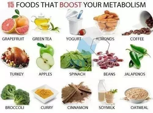 食品类像是西柚、绿茶、酸奶、杏仁、咖啡、火鸡、苹果、菠菜、豆类、墨西哥胡椒、花椰菜、咖喱、肉桂、豆奶和燕麦都对新陈代谢都很有帮助。营养品像是蛋白粉等的补给,不仅补充钙质,更让锻炼和日常生活更有精神。