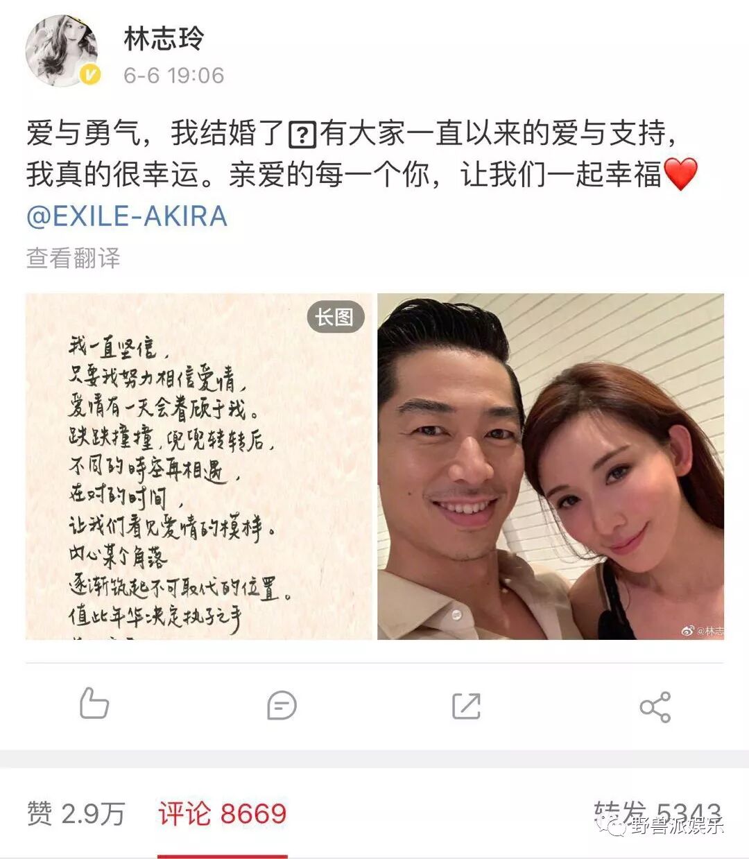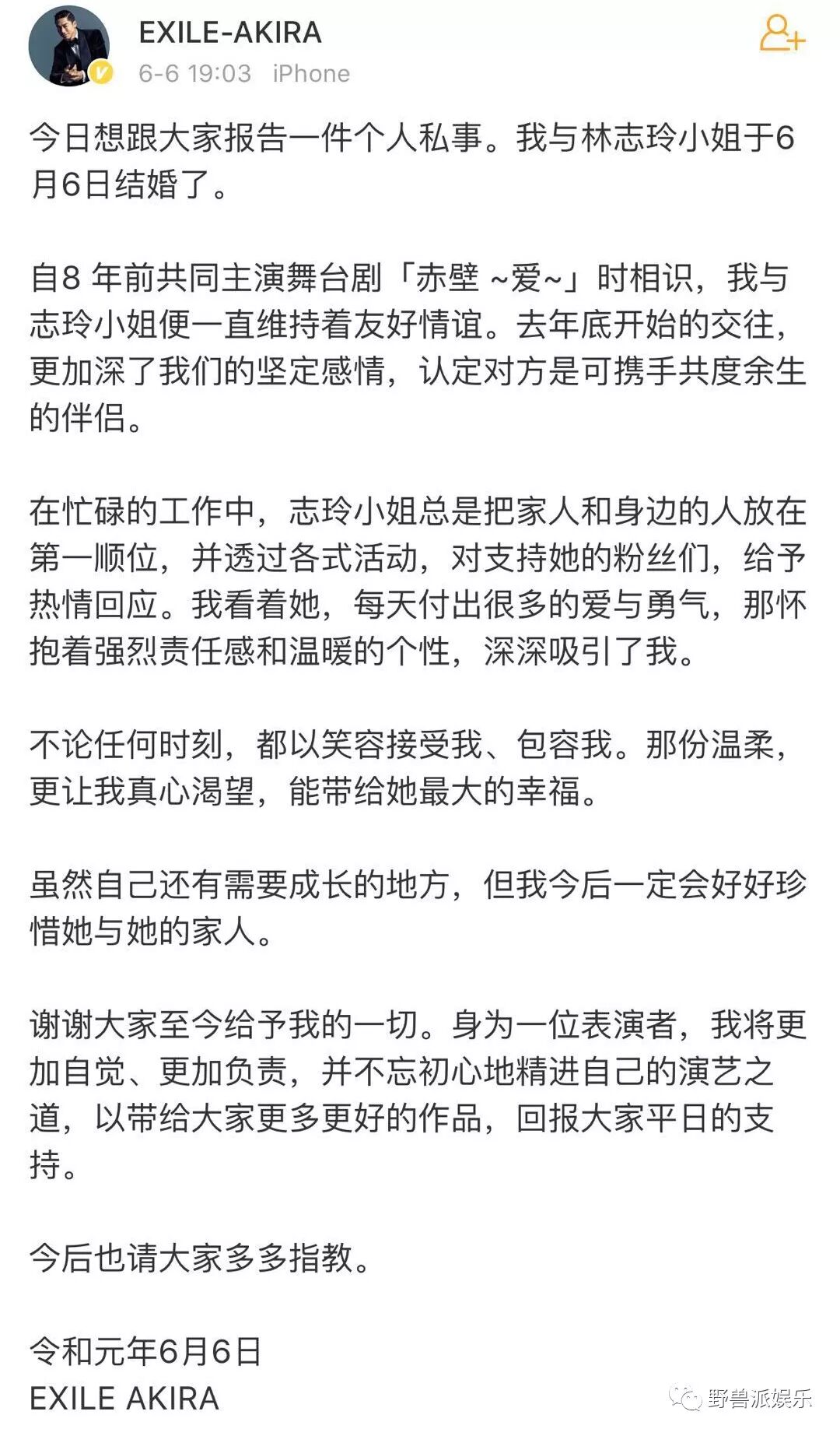 就在刚刚,林志玲在微博宣布和日本男子组合EXILE成员AKIRA(本名黑泽良平)结婚。
