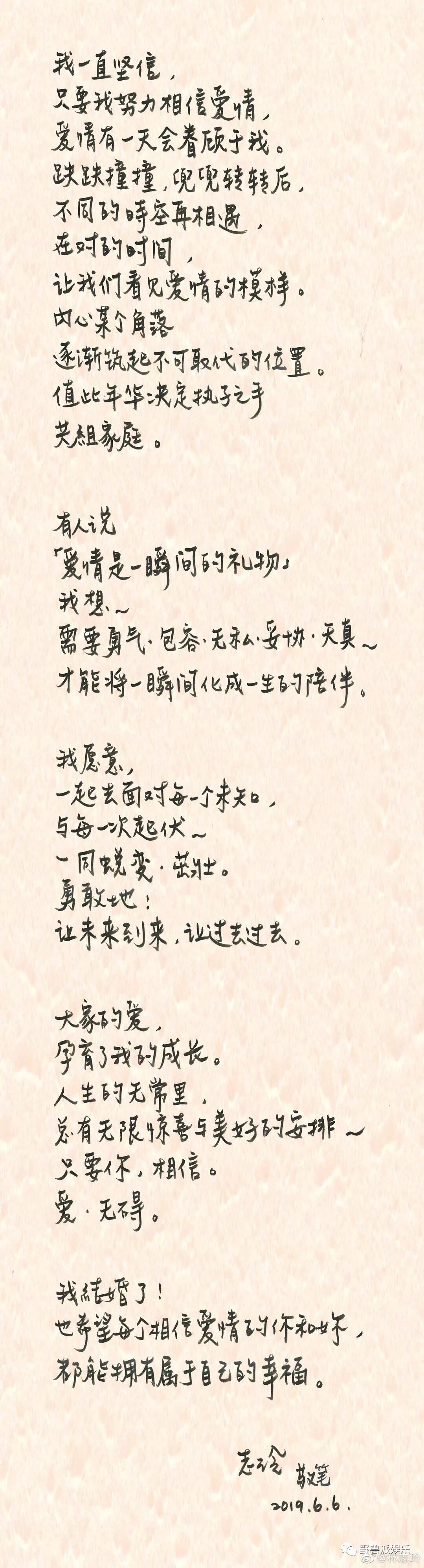 林志玲自己用手写信函形式向网友写出了当新娘的这一刻感受:我一直坚信,只要我努力相信爱情,爱情有一天会眷顾于我!