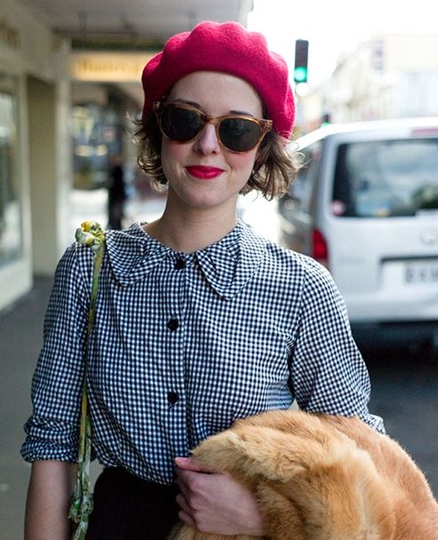 冬天的颜色比较沉闷,可以来一顶亮色的贝雷帽,玫红、酒红、姜黄、蓝色等等,搭配简单,看上去亮眼又有活力。