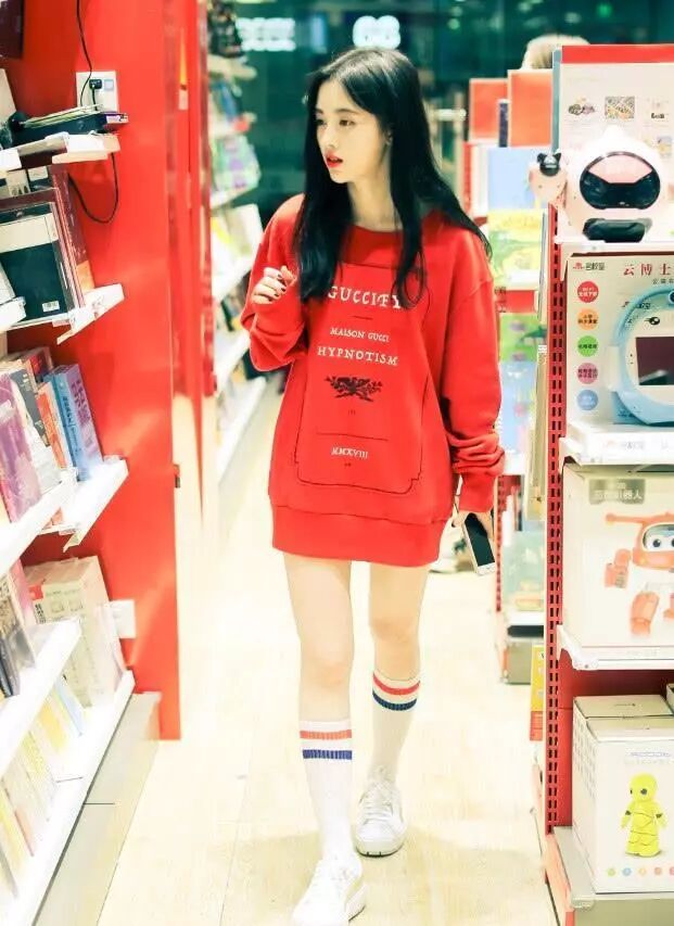 红色的长袖卫衣,露出三分之二的长腿,穿上长袜很有学生时代青涩的韵味呢!披着长发,更是让人有一种去保护她的心!