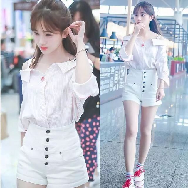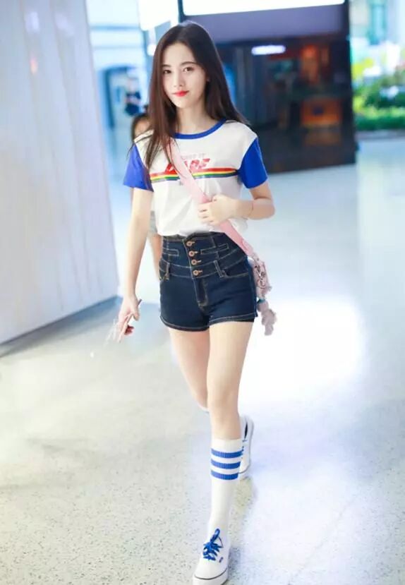 也正是因为鞠婧祎瘦,所以她穿起短裤来,特别的显高挑。像这件牛仔高腰短裤搭配圆领上衣,是不是很有朝气,也很年轻活泼!