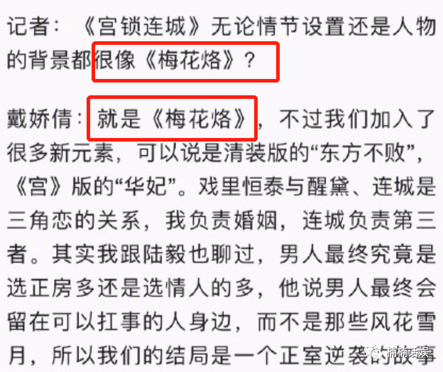 戴娇倩在2014年担任于正新戏《宫3》的女配角,在访谈中直言“虽然《宫3》剧情加入了很多新元素,但就是《梅花烙》“,这一举动直接激怒导演于正。