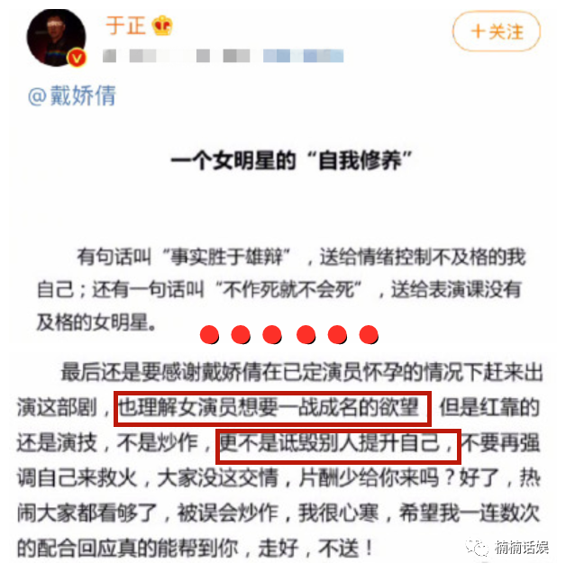 于正连发多条微博攻击戴娇倩,甚至发长文《一个女明星的“自我修养”》字里行间讽刺戴娇倩想要一战成名,诋毁别人提升自己。结果最终于正也承认了自己的抄袭行为,并且向《梅花烙》作者琼瑶道歉。