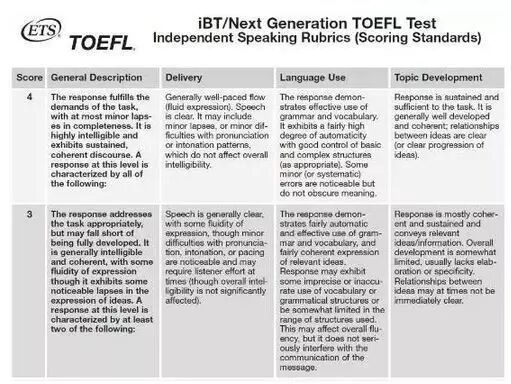 众所周知,托福口语的评分标准分为5个分数区间(0—4分),每个问题单独评出0—4分之后,再根据平均分得出最后的分数(0—30分)。就总体而言,想要拿到4分,考生们必须尽量完整地完成考试任务,并清晰而连贯地进行口语表达。