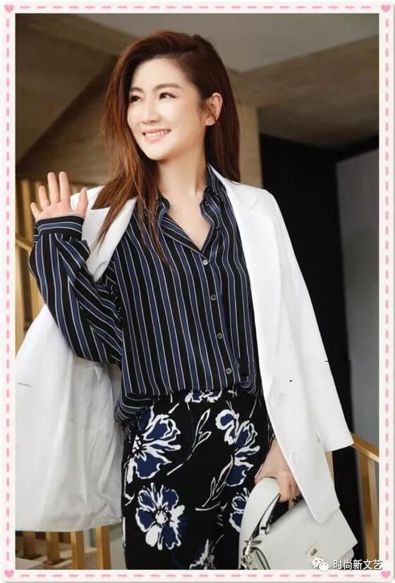 上面是一件黑蓝色的条纹衬衫,下面搭配 上了一条黑色的半身裙,半身裙上印着白蓝色的花朵,肩上又披了一件白色的西装外套。本来是比较显老气的穿搭,可是因为这件白色的西装外套,整体造型就显得清爽了不少。