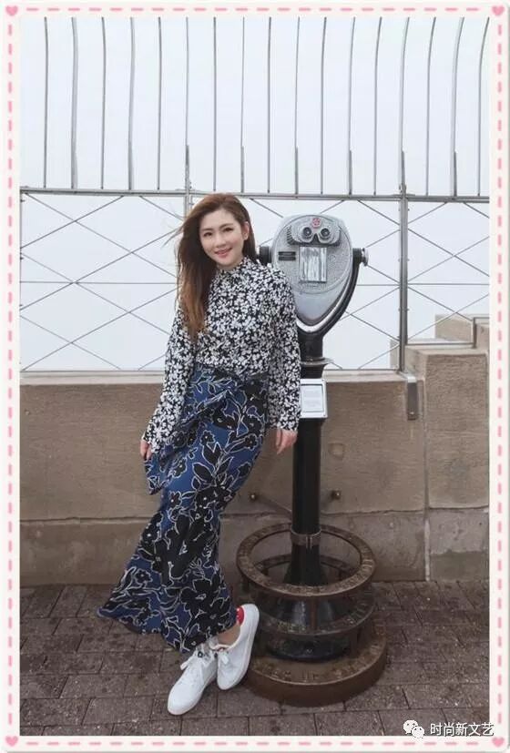 任家萱的造型一直都是以这种深色调为主,上面一件黑白色的小花花,下面搭配上一条深蓝色的半身裙,还印着黑色的花朵。整体造型的颜色偏暗,看起来真是完全显出任家萱青春靓丽的感觉。