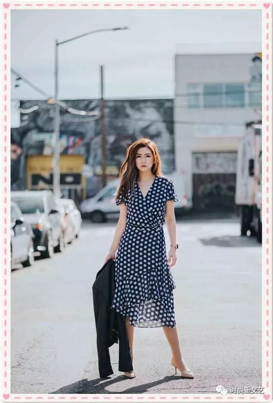 蓝色的雪纺连衣裙上印着白色的波点,波点裙穿起来就给人一种特别清爽的感觉,虽然颜色不够粉嫩,但是因为面料轻薄,所以也是给人一种比较清爽的感觉。