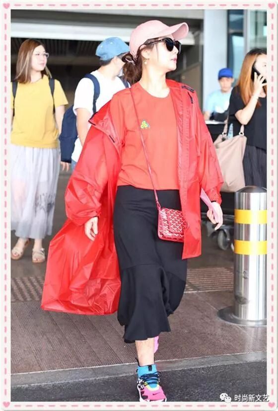 里面一件橘色的T恤衫,下面搭配上了一条黑色的半身裙,外面又罩上了一件红色的透视外套,这种造型看起来真是让人感觉有些辣眼睛。