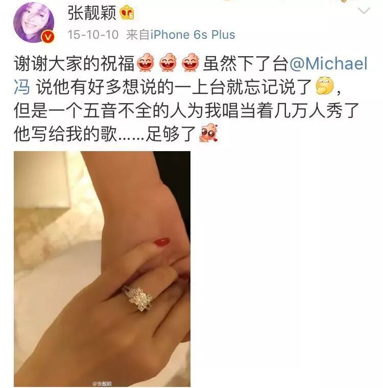 张靓颖开心的在微博上晒了钻戒,写到:“一个五音不全的人为我唱,当着几万人秀了他写给我的歌……足够了”