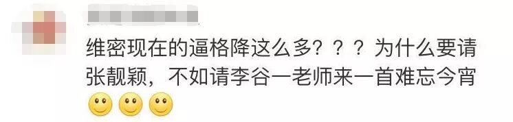 “维密现在的逼格降这么多???为什么要请张靓颖,不如请李谷一老师来一首难忘今宵”