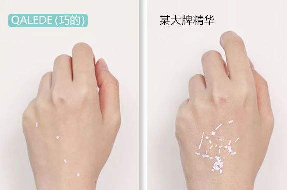 QALEDE(巧的)这项微囊渗透科技,说着就两步:一分,把高浓度肽液切割为1/1000的微粒;二包,用特殊脂质体包裹保证绝对活性,能在3-5秒内直达肌底并持续存活,一上脸就像打了微针一样饱满有弹性,莹润透光,Q弹娇嫩如刚剥开的水煮蛋。