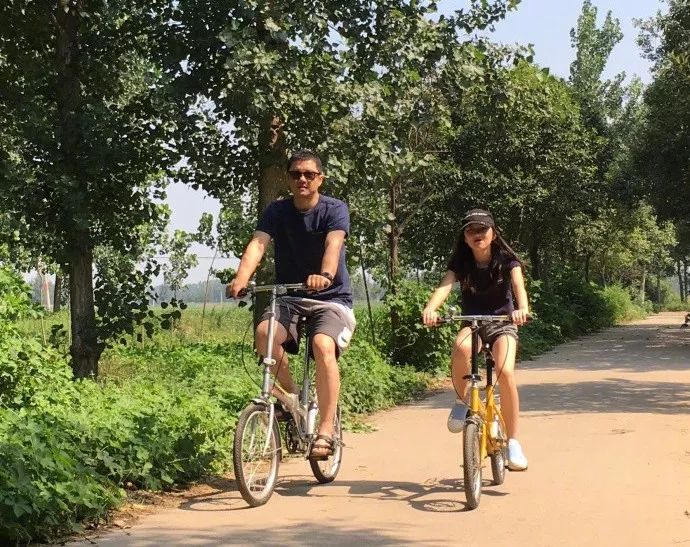 带着女儿在乡间小道上骑自行车,好不自在惬意!