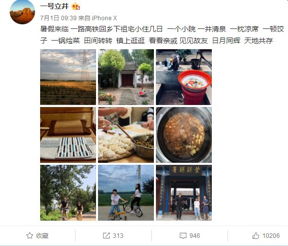 他写道:暑假来临,一路高铁回乡下祖宅小住几日。一个小院,一井清泉,一枕凉席,一顿饺子,一锅烩菜,田间转转,镇上逛逛,看看亲戚,见见故友,日月同辉,天地共存。