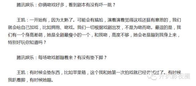 在腾讯的采访中,王凯说聊到剧中的吻戏时说: