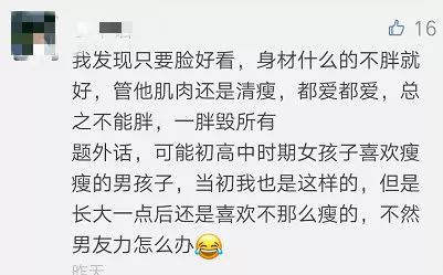 看来对于身材的审美,每人都有自己的偏好,这些偏好可能会随着成长而改变,唯一不变的是:只要脸长得好看,什么身材都会觉得很nice。