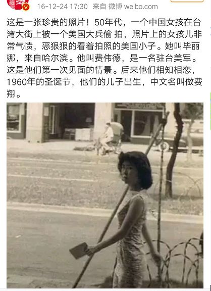 一天,妈妈走在街头发现自己正在被一个美国大兵偷拍,表情看上去有点生气。这个美国大兵正是费翔的父亲。