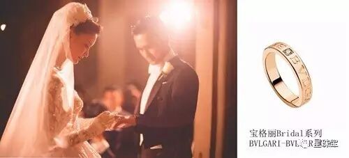 在交换戒指的重要仪式上,伴郎胡歌为新郎、新娘送上结婚对戒,新人选择了宝格丽经典的BVLGARIBVLGARI系列对戒,玫瑰金和点睛之笔的钻石与宝格丽双LOGO相互映衬,低调优雅间不失璀璨亮点。