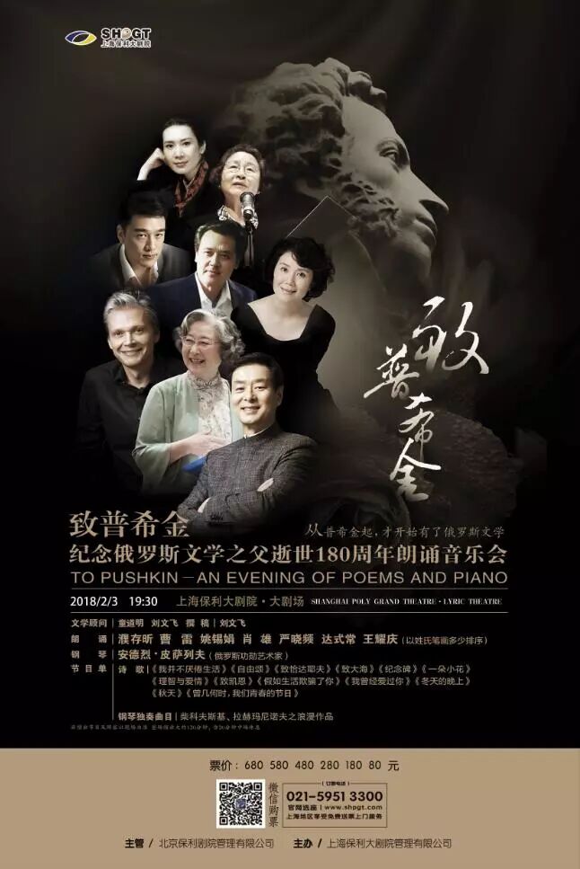 2018年2月3日,王耀庆将与一众重量级朗读者将齐聚上海保利大剧院,带来一场跨越两个世纪的“见字如面”,以一场特别的朗诵音乐会,再次致敬文学巨擘普希金。强大的阵容还有人艺戏骨濮存昕、配音大师曹雷、百变声优姚锡娟、金鹰视后肖雄、影视演员严晓频、资深演员达式常及俄罗斯功勋艺术家安德烈·皮萨列夫,非常值得期待!