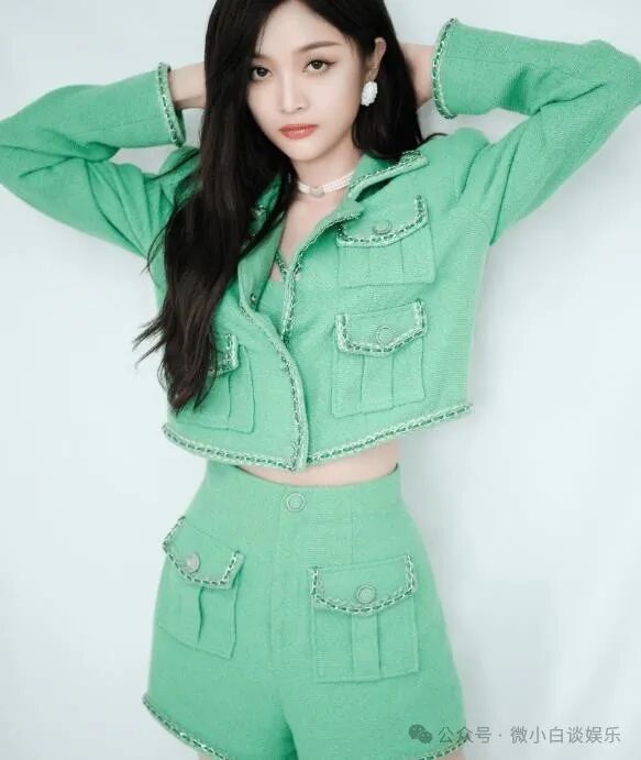吴宣仪的薄荷绿套装上衣设计独特,采用了修身的剪裁,展现出了她曼妙的身材曲线。上衣的领口设计恰到好处,既展现出了她的颈部线条,又凸显了优雅的气质。同时,上衣的袖子设计也颇具巧思,采用了宽松的喇叭袖设计,既增加了整体的层次感,又巧妙地遮盖了手臂的赘肉。这种衣服搭配不仅展现了吴宣仪对时尚的独到见解,更在细节处体现了她对自己身材的精准把控。