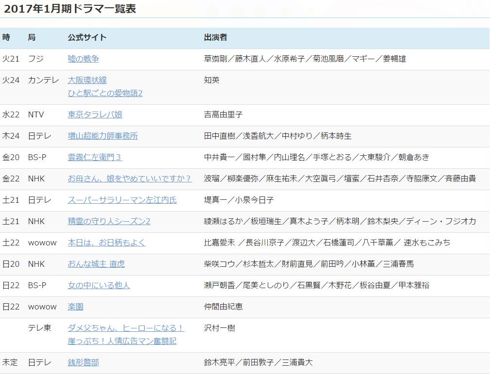 2017年冬季日剧一览表(暂定14部)↓