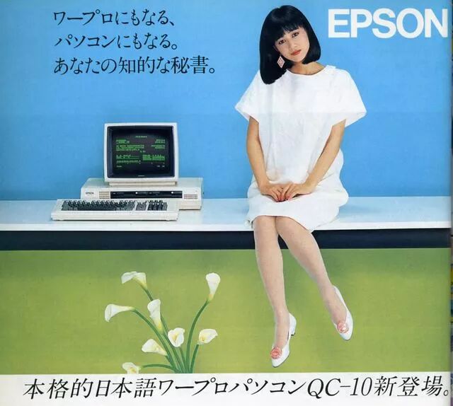 同时期爱普生也参与过个人电脑的竞争,发布过 QX-10、QX-20、HX-20 等等型号的个人电脑。杂志广告视觉突出的重点则是商务办公,虽然还是八十年代,但整体风格已经在向现代广告的框架过渡,和上面日立的构图就完全不同了。