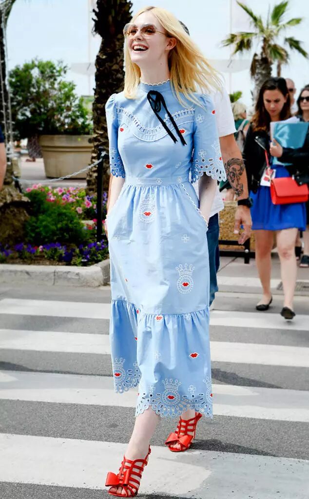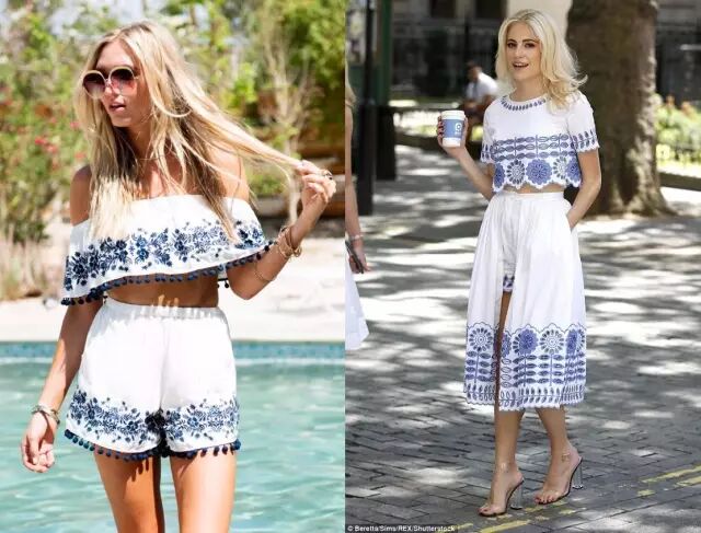 一身蕾丝怕穿不好,可以尝试半身蕾丝裙,白色短上衣依然是蓝色的最佳CP!