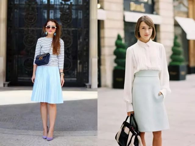 淑女气质的MM,可以选择及膝蓝色百褶裙,或者干净利落的素色裹身裙。