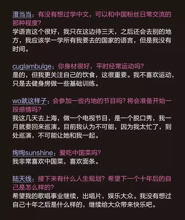 A:中国的粉丝很棒,每一次我来到这里都能感受到爱与尊重,他们非常友善,每每看到有这么多中国粉丝,我都非常激动,举例来说之前我有一个节目录制,很多粉丝都到现场观看。能见到这么多人,并和他们互动,我感到很开心。