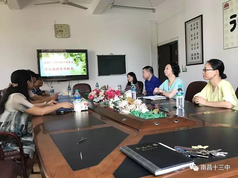 2017年8月1日上午,南昌十三中迎来了一年一度的节能减排专项检查。南昌市教育局节能工作检查组宗萍、万来斌、吴建飞一行三人轻车简行,莅临南昌十三中,对学校节能减排工作情况进行督导检查。校长黄秋兰、副校长朱强、张玉璠、徐泓等全程参与迎检。