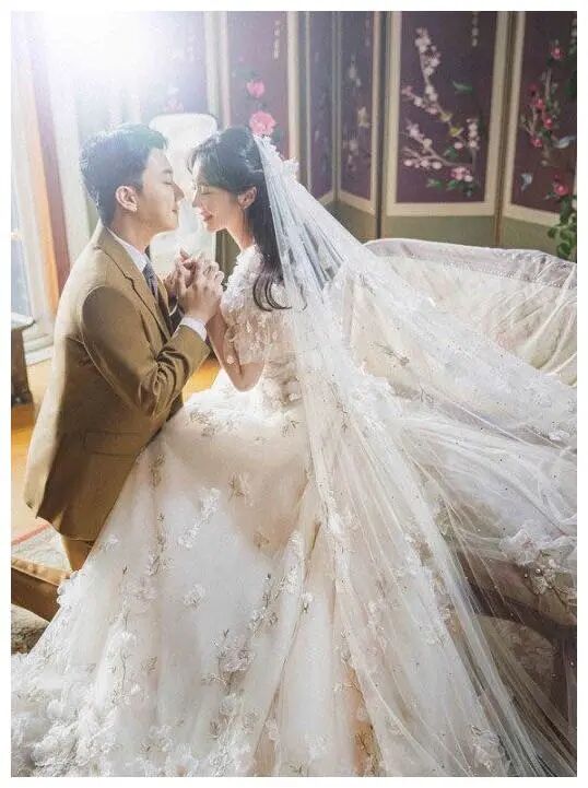 男方则是穿着浅棕色的西装,颜值看起来还是蛮高的。他握着裴涩琪的双手,相拥相吻,闭着双眼却笑颜如花,令人动容。后面的背景,看起来有点像那种古代的屏风,装修也挺豪华的。