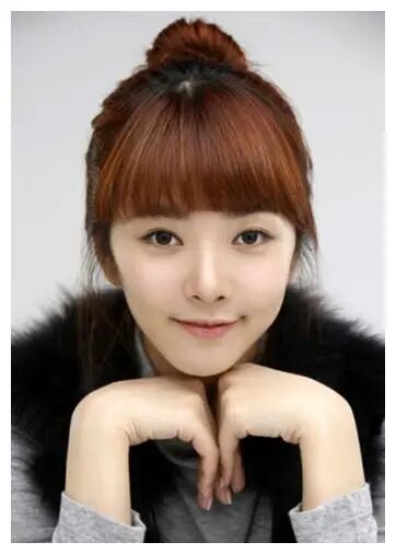 还有平刘海的。穿着灰色的衣服,搭配黑色的颈围,扎着丸子头。应该是以前很流行的一个发型了。