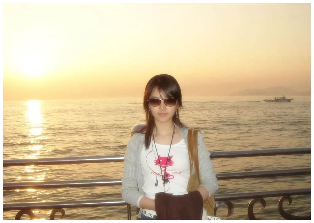 还有这种一点酷的,灰色外套搭配着白色内搭,散着披肩发,戴着墨镜,挎着单肩包,背后是河,日落洒在水面上,一片金黄。不远处,好像还有一叶孤舟在行驶,意境辽阔壮远。