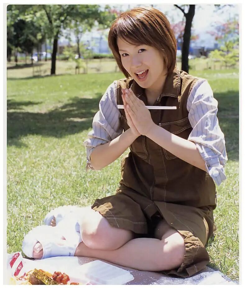 以及短发的她,穿着假两件的裙子,坐在草坪上,前面铺着布放着美食,背景应该是在公园,或者景区。看样子是在野餐。