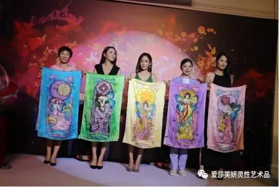 当晚活动第二个主题是“爱莎·美妍”上市发布会。随着创始人爱莎和美妍共同触启能量艺术之光,现场星光闪耀,十幅巨幔令人震撼地从天而降,如梦,似幻,宣告了“爱莎·美妍”能量艺术丝巾的正式上市。此次“爱莎·美妍”共推出了5款丝巾作品,分别是:《太阳·圣杯》、《木星》、《所罗门之结》、《权利之眼》、《八芒星》,限量发售,而且每款上面都拥有指定唯一的限量标号,具有很大的观赏及收藏价值。其中,《太阳·圣杯》所代表和象征的,是正能量,光明和至高无上的地位,寓意心想事成,一帆风顺。《木星》在罗马神话中是主神朱庇特,红色木星代表着幸运。《所罗门之结》是一个古老的神秘符号,还意味着皇室尊贵身份,代表的是生命力和守护的力量。《权力之眼》又称全知之眼,代表的是敏锐的智慧。《八芒星》是最古老的一颗行星,在全世界的文化当中都有积极的内涵,它代表着奇迹、神秘与希望。