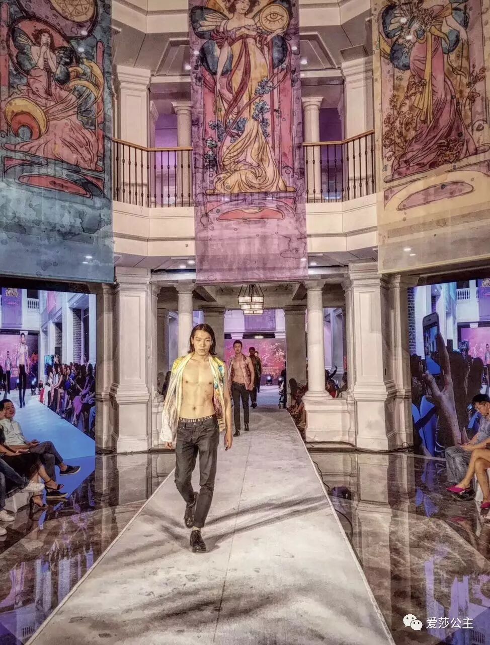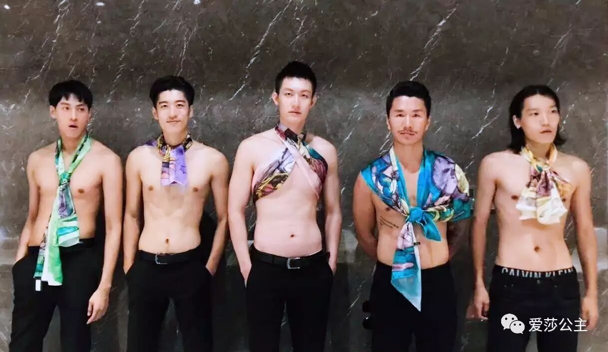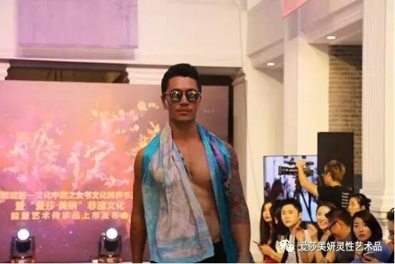 (图为性感男模现场展示“爱莎·美妍”能量丝巾)