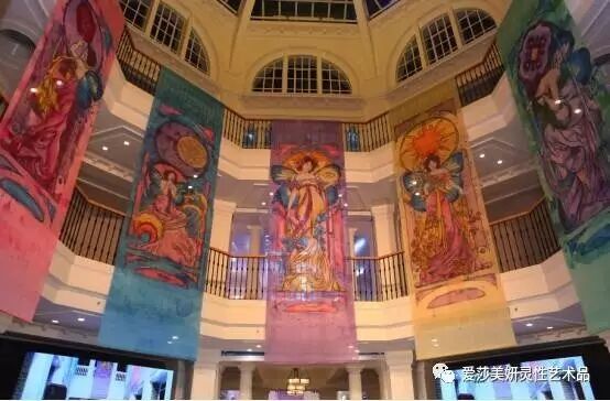 (图为发布会现场震撼展示的“爱莎·美妍”能量艺术丝巾巨幅)