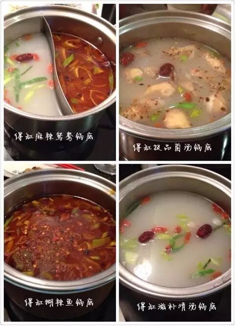 有滋补清汤火锅、滋补参汤火锅、麻辣鸳鸯火锅、极品菌汤火锅、酸菜锅、羊排锅,还有招牌糊辣鱼火锅