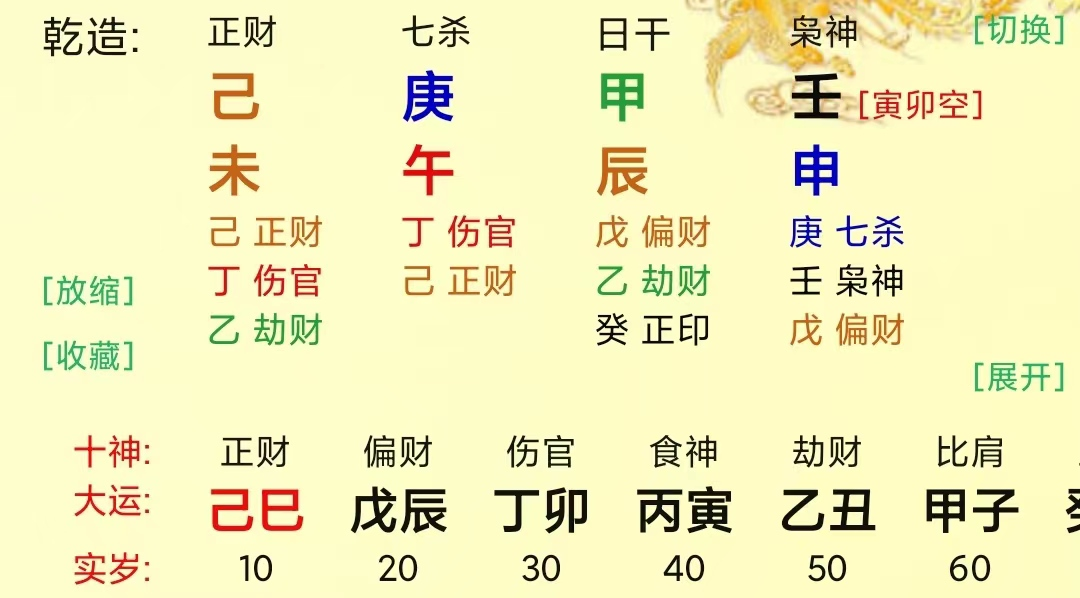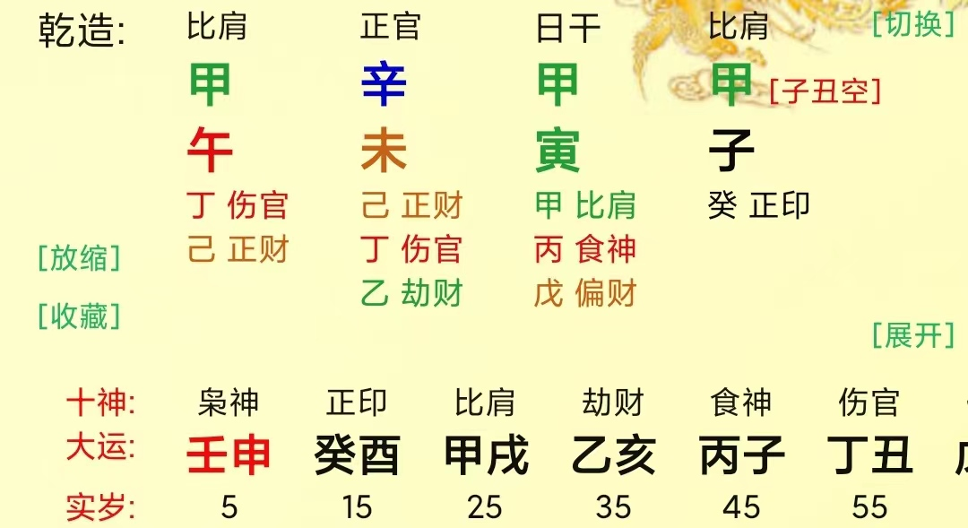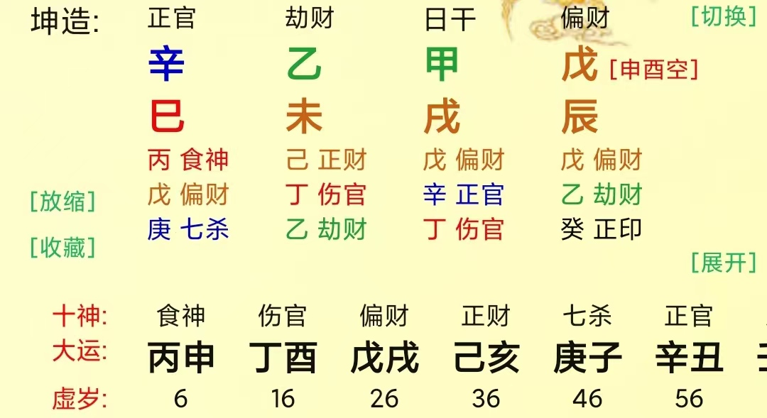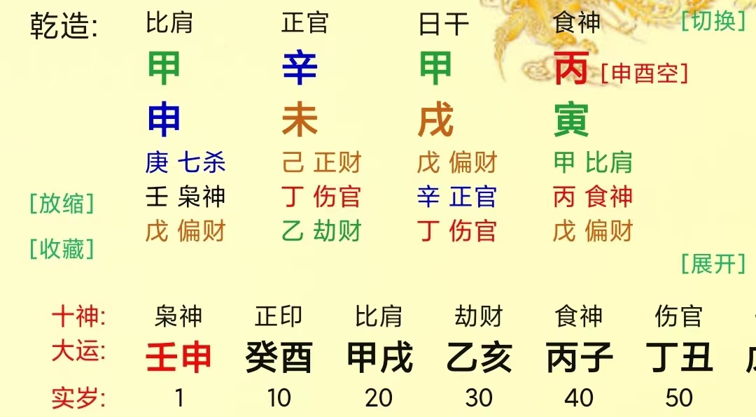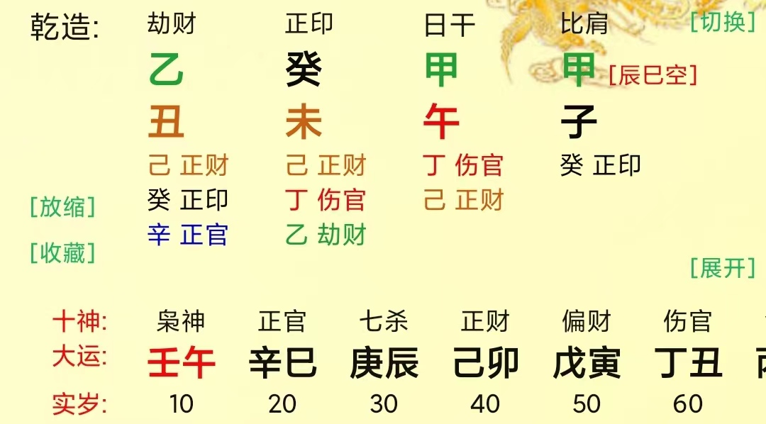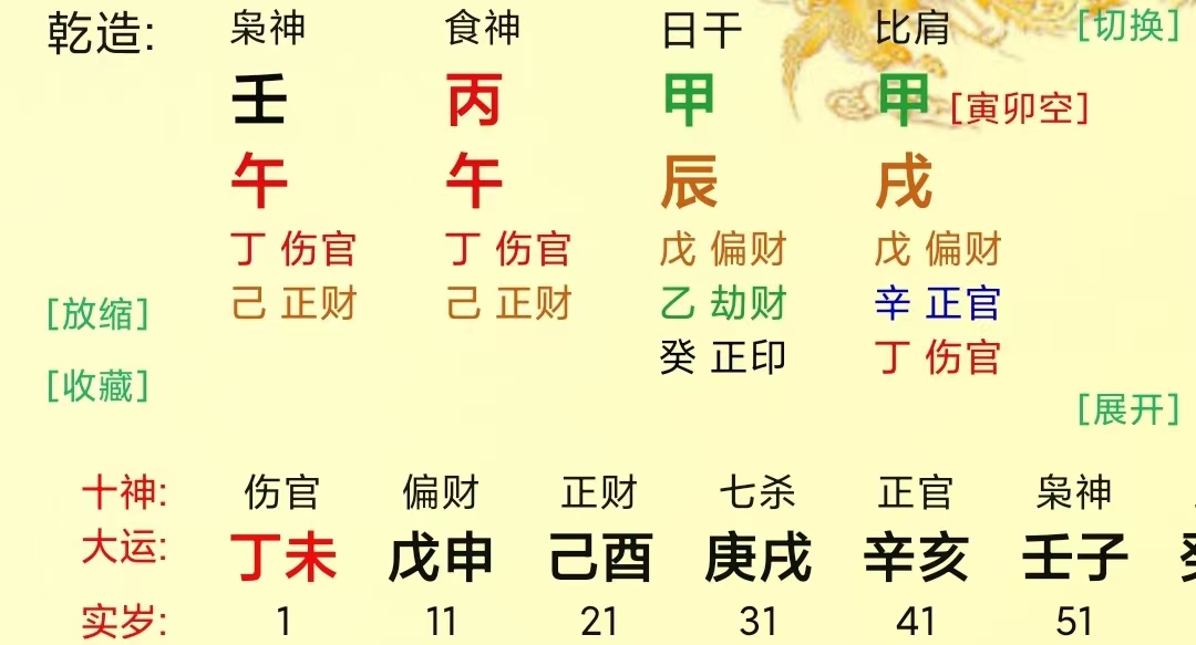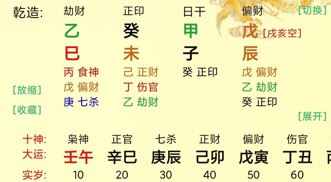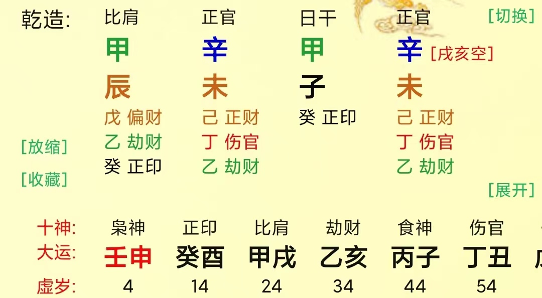 徐乐吾曰:凡化气格,必以生我化神者为用,甲己化土者,必以丁火为用也,以用神为子,以火为用者,故以丁火为子,以化神所克为妻星,故以癸水为妻也。二己争合,则非化气格,看妻子法,与普通同,财旺身弱,当以比劫为用者,即见戊辰,亦不以化论,即以比劫为子。从用神看子星,生用神之印为妻。故甲乙为子,壬癸为妻也,余仿此。