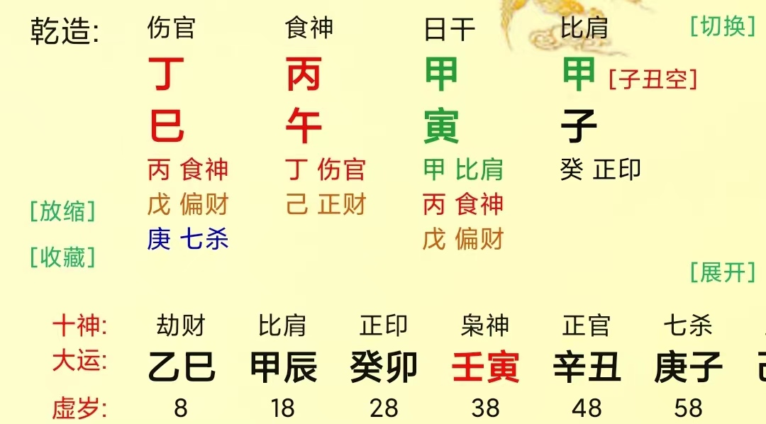 徐乐吾曰:若满局丙丁,不见金水官煞印绶,木火伤官,变为炎上,又名从儿,局势偏旺,不宜逆其旺势,从全局论之,即炎上格也。