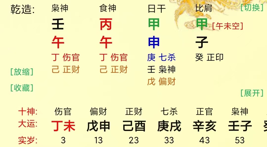 徐乐吾曰:三夏甲木取用之法,以夏至为分界,夏至前与四月相同,木性虚焦,调候为急,不能缺癸,丁火为佐,水仗金生,以庚为配合,理同四月。