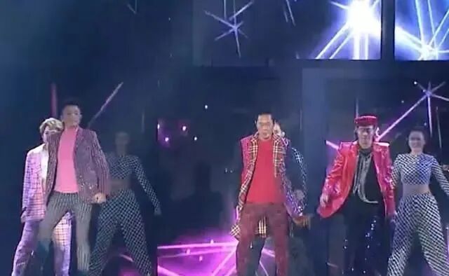 草蜢组合穿着红色衣服出镜,看起来相当喜庆。作为唱跳组合,他们当然要带来劲歌热舞,年过半百的三人,依旧充满活力,一点不输新生代艺人。