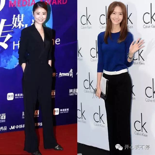 阔腿裤今年很流行,林心如选择这套黑色连体裤超时髦干练的,深V设计还很性感,允儿穿深蓝色针织衫搭黑色阔腿裤,多了一抹亮色,很吸睛。