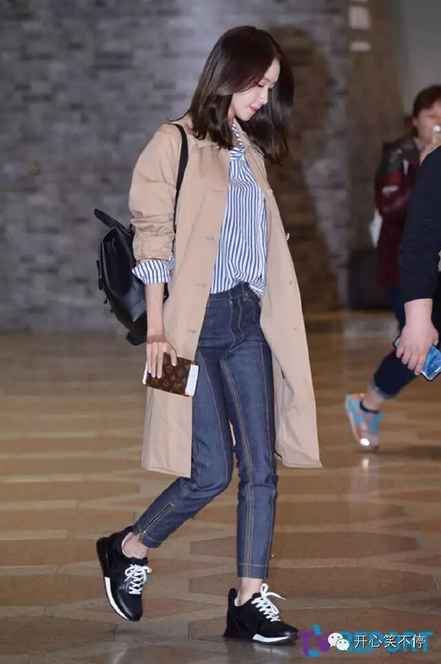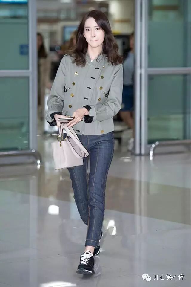 私服街拍允儿特别爱穿牛仔裤,搭浅军绿色双排扣短外套,脚踩运动休闲鞋,简约又帅气。