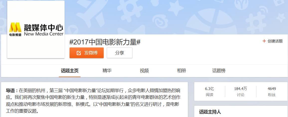 截至发稿前,由电影频道融媒体中心发起的话题#2017中国电影新力量#取得6.3亿的阅读量(目前还在持续攀升中),在微博电影榜上排名第一。电影频道融媒体中心制作并发布的短视频牢牢占据微博热搜榜的榜首位置,并在前四名中占据3席。反响非常热烈。
