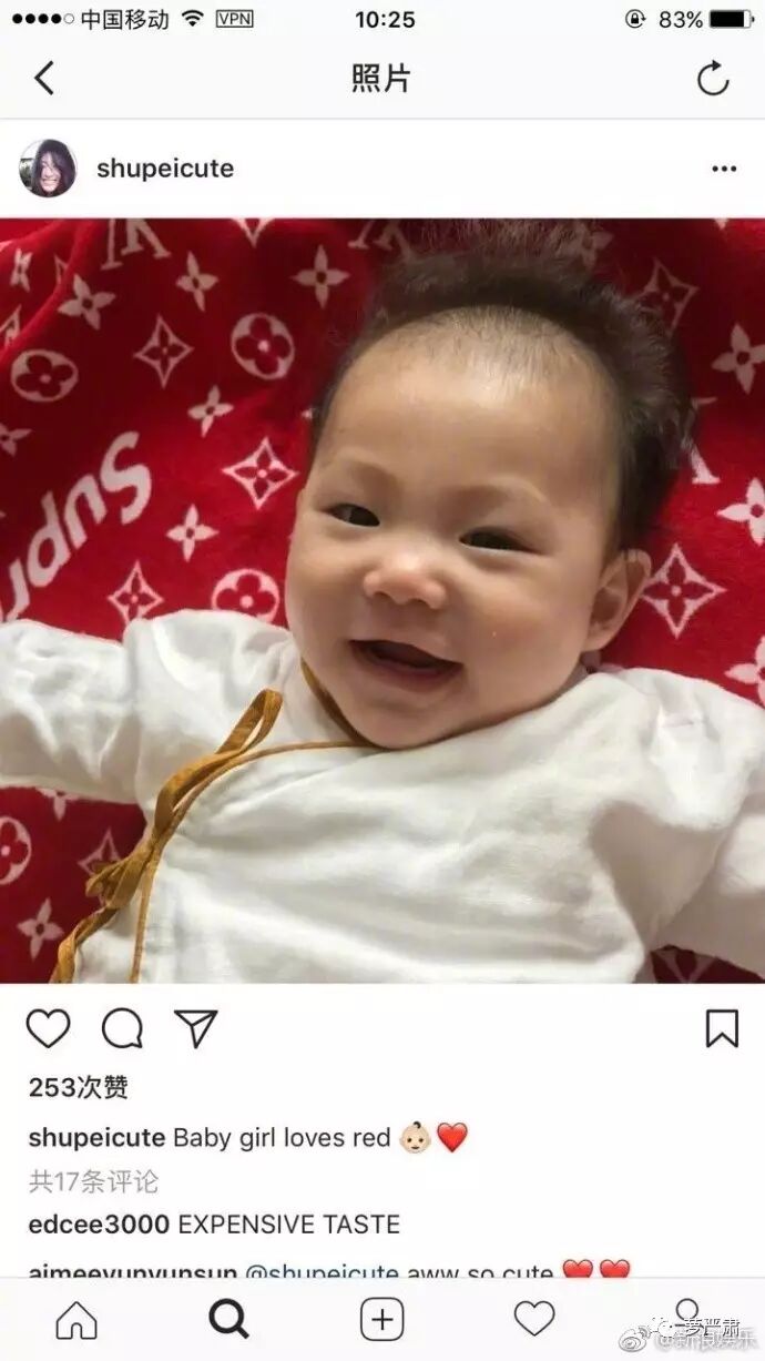 秦舒培晒的孩子照片里,大家清楚地看到这孩子裹着又贵又买不到的LOUIS VUITTON x SUPREME……