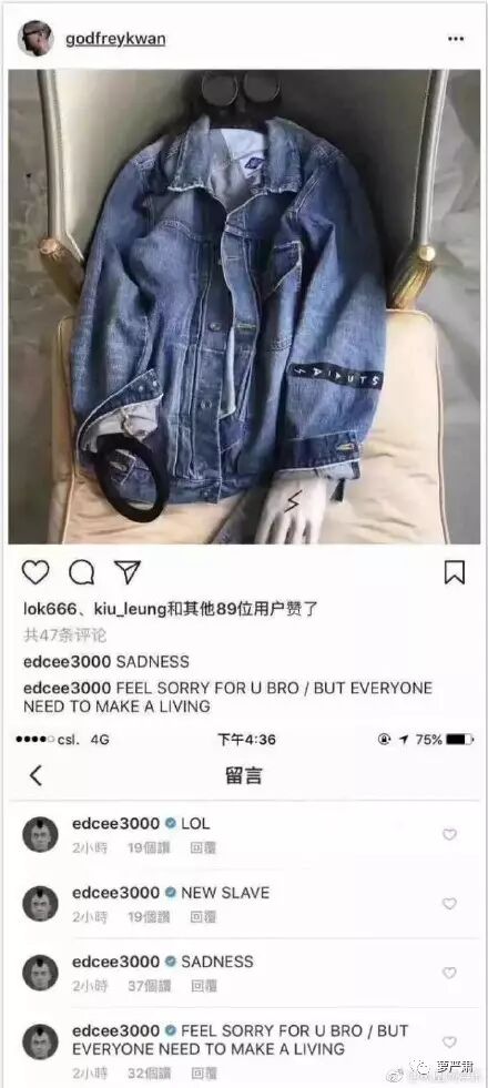陈冠希服装品牌设计师在晒出一件余文乐旗下品牌的衣服,陈冠希在评论区留言数条,暗讽余文乐抄袭:“SADNESS(难过)”“BUT EVERYONE NEED TO MAKE A LIVING(但谁不是为了谋生呢)”“NEWSLAVE(新奴隶)”。