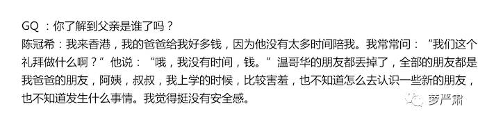 陈冠希父母离异,跟母亲在加拿大生活,他是9岁之后对父亲有兴趣才主动要求到香港来生活的,但父亲陈泽民也没给他多少教育和陪伴。